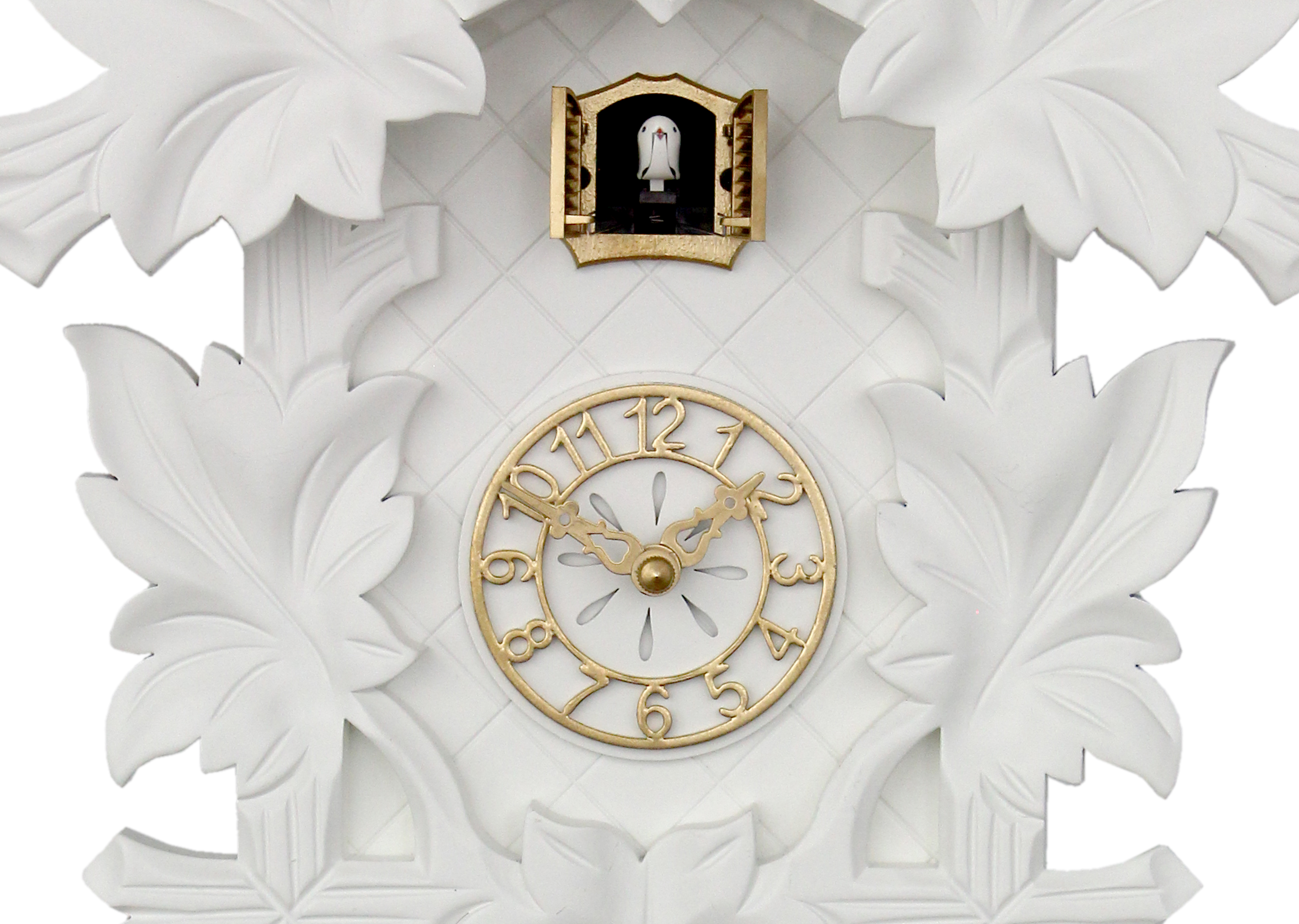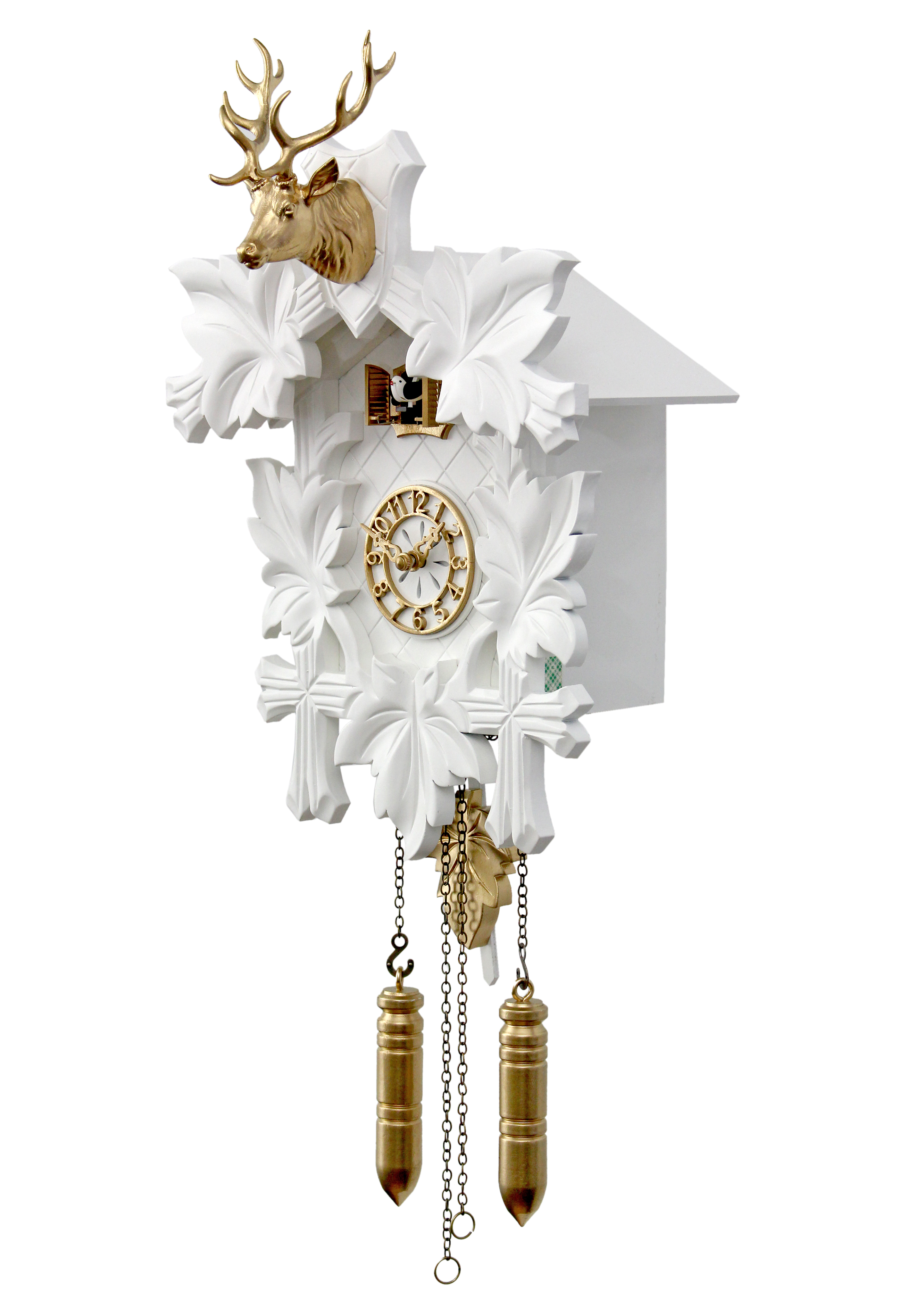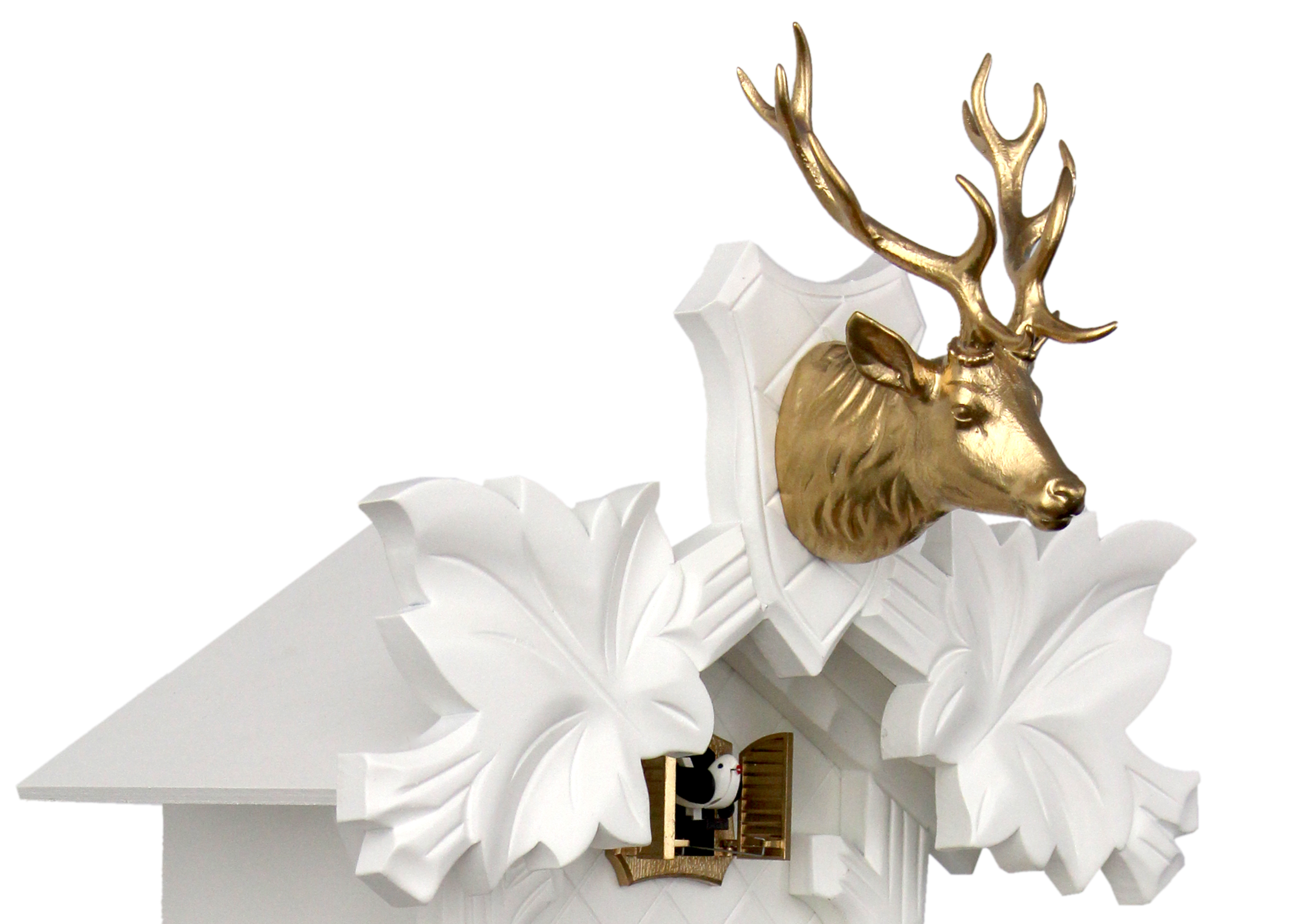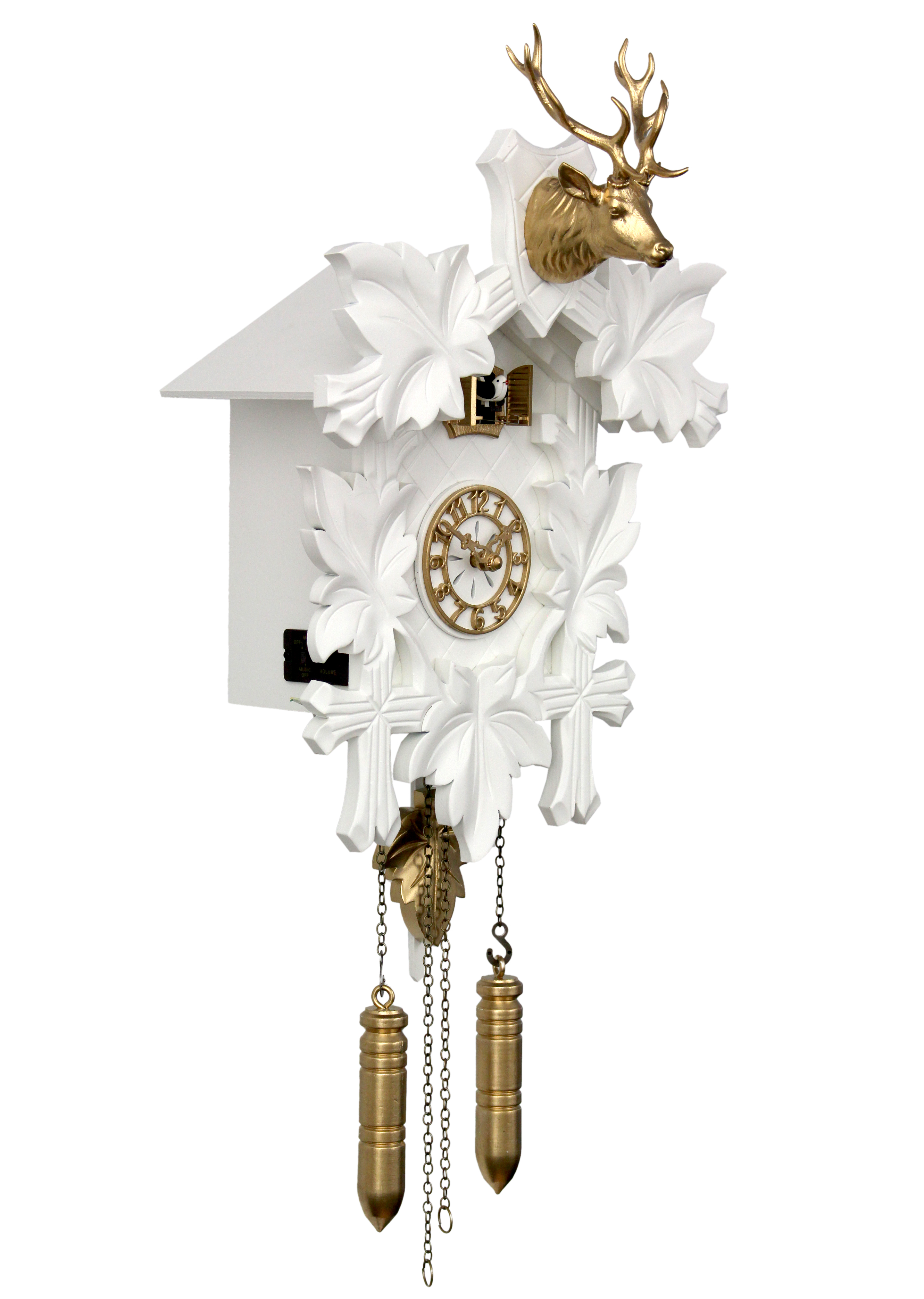 Eine klassische Schwarzwälder Kuckucksuhr in weiß und gold mit handgeschnitztem Weinlaub und Hirschkopf. auf Lager - weltweite Lieferung